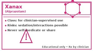 Xanax (alprazolam) is a drug in the benzodiazepine class used to treat anxiety disorders and panic attacks. It works by reducing excitability in the central nervous system, which helps reduce feelings of anxiety and tension.